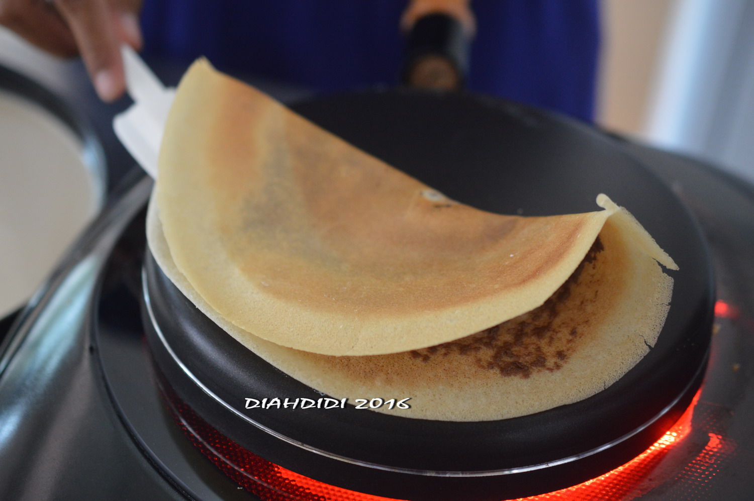 Jadi buatku, cukuplah pakai wajan kewalik, hasilnya tetap bisa kriuk renyah juga, cuma harus sabar ya, perlu waktu, minimal 3 menit baru kering..hihi. Selain isi selai aku tadi buat isian gurih pakai daging asap dan sosis, di padu keju Mozarella..wah enak juga ternyata. Bisa juga di isi telur orak arik lho teman-teman..pokoknya..kue leker ini cocok di isi apa aja kok, sesuai selera kita. Tapi selain selai coklat aku isi selai blueberry juga enak. Tapi, karena pembelinya udah pada nganti ( cuma Yodha dan Dik Zahra sama Quraisy sich..:D ) kok ya begitu matang langsung habis..haha..jadi fotonya langsung di wajan aja..:D